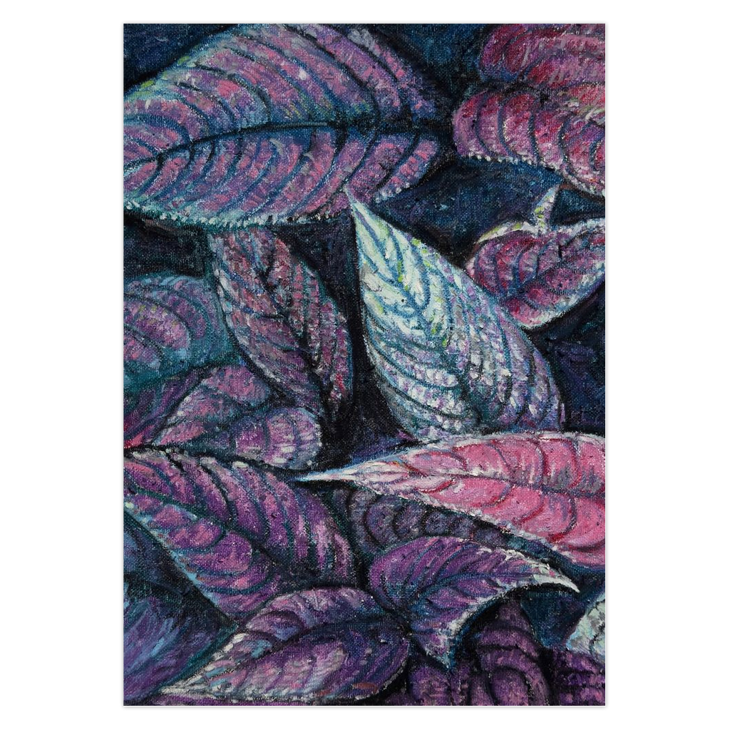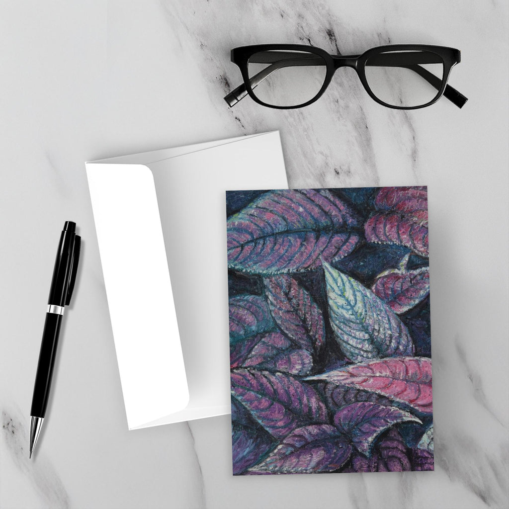 A small stack of artful greeting cards featuring lush, painterly foliage in deep purples and teal-blue highlights. The image feels like a quiet midnight garden—textured leaves overlap in layered brushstrokes that invite a slow, attentive look. Folded and ready to write arrives with a clean white envelope. These cards bring a thoughtful, tactile way to send a note of comfort, gratitude, or simple hello to someone who appreciates handcrafted, botanical-inspired art.